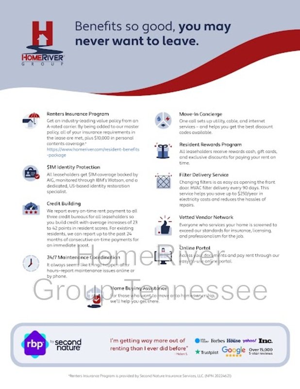 *The estimated total monthly leasing price does not include utilities or optional/conditional fees, such as: pet, utility service, and security deposit waiver fees. Our Resident Benefits Package includes required Renters Insurance, Utility Service Set-Up, Identity Theft Protection, Resident Rewards, HVAC air filter delivery (where applicable), and Credit Building, all at the additional monthly cost shown above. To learn more about additional leasing fees and requirements, please contact HomeRiver Group at 833-730-2002.