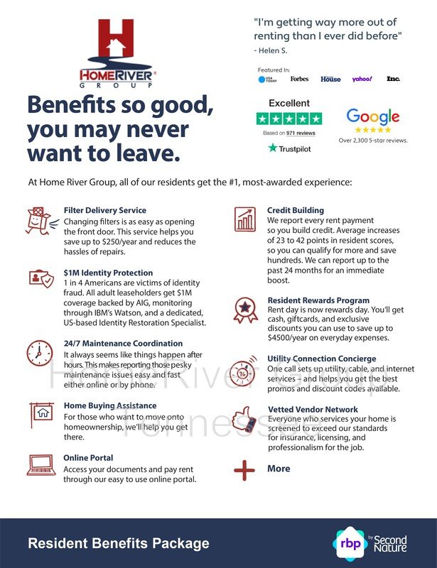 *The Estimated Total Monthly Leasing Price reflects the Base Rent plus our Resident Benefits Package, which includes required Renters Insurance, Move-In Concierge, $1M Identity Protection, Resident Rewards, Filter Delivery (where applicable), and Credit Building. Estimated Total Monthly Leasing Price does not include utilities or optional/conditional fees, such as: pet, utility service. To learn more about additional leasing fees and requirements, please contact HomeRiver Group at 833-730-2002.