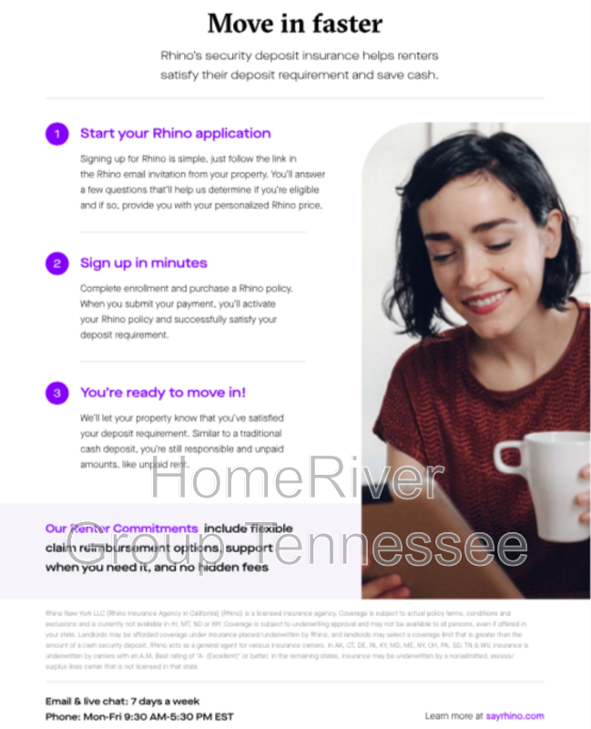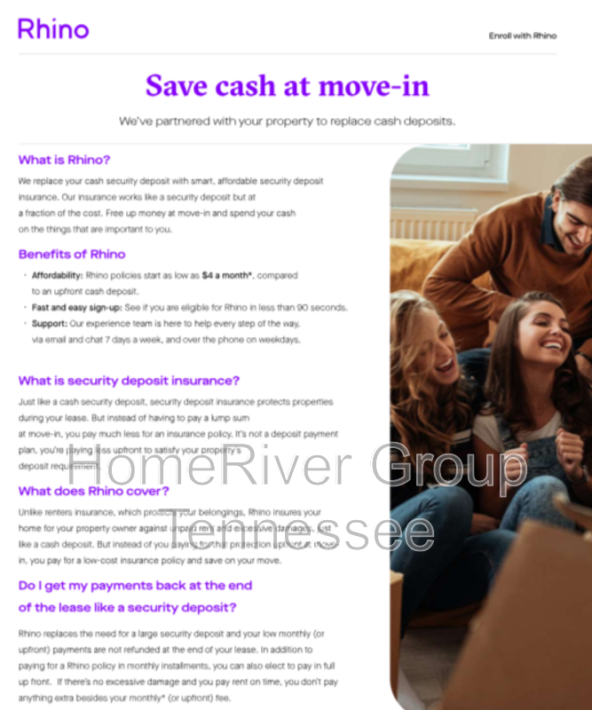 HomeRiver Group has partnered with Rhino to offer an affordable alternative to upfront cash security deposits. Approved residents can choose between paying a security deposit equal to one (1) months rent OR purchase a deposit replacement policy with Rhino at a fraction of the upfront cost. For more information, visit SayRhino.com.